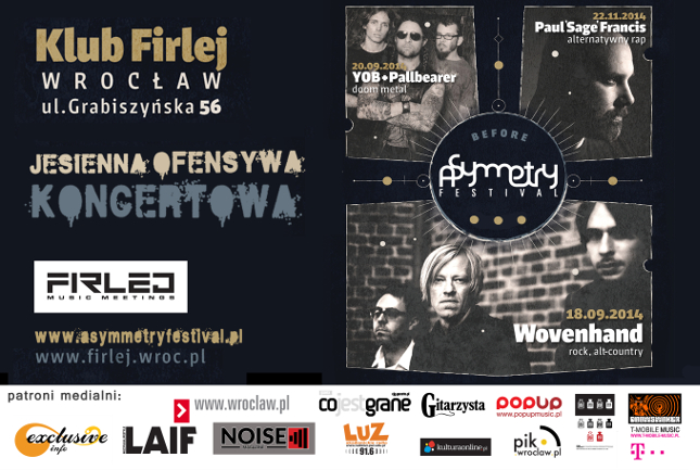 Asymmetry Before Party to cykl koncertów zapowiadających przyszłoroczną edycję festiwalu Asymmetry Festival, który odbędzie się we Wrocławiu. 18 września przed publicznością klubu Firlej zaprezentuje się kultowa amerykańska formacja Wovenhand, która od lat w wyjątkowy sposób łączy rock z alt-country i elementami folku. Dwa dni później swoją piekielną moc ujawni w całej okazałości jeden z najważniejszych metalowych zespołów ostatnich lat – Yob. Natomiast 22 listopada za mikrofon chwyci Paul „Sage” Francis, raper znany z zaangażowanych społecznie i odważnych tekstów.