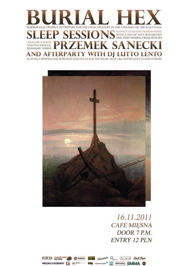 Zapraszamy na kolejny wieczór muzyki eksperymentalnej w Cafe Mięsna w Poznaniu. Tym razem zagrają Burial Hex, Sleep Sessions i Przemek Sanecki, a o afterparty zadba DJ Lutto Lento.