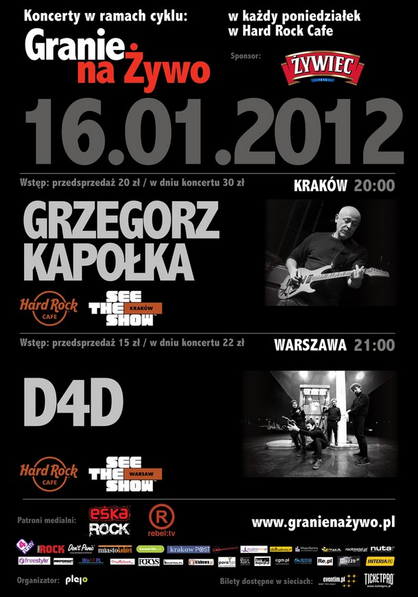 Już 16 stycznia 2012 w Krakowie zagra mistrz gitary elektrycznej - Grzegorz Kapołka. W Warszawie natomiast będziemy mięli okazję posłuchać niezwykłego elektronicznego kwartetu – grupy D4D. Całość odbędzie się w ramach cyklu Granie Na Żywo.