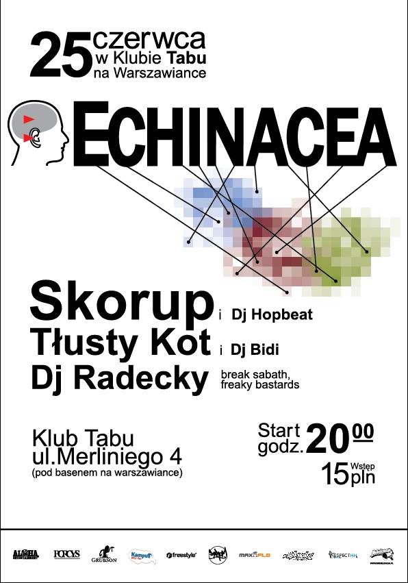Aloha Entertainment i MaxFlo Records zapraszają na jedyna w swoim rodzaju stołeczno-śląską hip-hopowa bombe, która wybuchnie w sobotę 25 czerwca w klubie Tabu przy ul. Merliniego 4 na warszawskim Mokotowie. Długo oczekiwane w Warszawie koncerty zagrają zespół Echinacea oraz Skorup. Przed nimi na scenie zaprezentują się Tłusty Kot i DJ Bidi, natomiast afterparty po występach rozkręci DJ Radecky. To będzie gorący wieczór pełen tłustych bębnów i skondensowanej artystycznej wyobraźni. Nie zabraknie także innych niespodzianek dla gości.