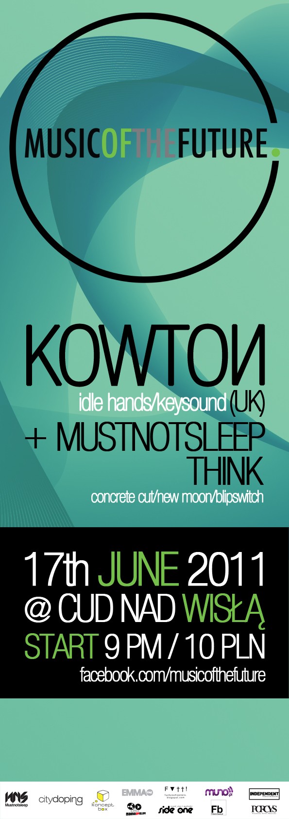 Music of the Future to impreza organizowana przez warszawski kolektyw Djski - Mustnotsleep, która kontynuuje profil działania kolektywu, czyli intensywne promowanie na terenie Polski inteligentnej elektroniki, by dotrzeć z tą muzyką do jak najszerszego grona słuchaczy i klubowiczów. Ta wyjątkowa impreza będzie gościć jednego z najbardziej interesujących brytyjskich producentów ostatnich lat: Kowtona, znanego z łączenia w swoich setach subbasowego świata z żywiołową rytmiką house'u. Oprócz niego wystąpią organizatorzy: Mustnotsleep, którzy jako jedni z pierwszych w Polsce zaczęli przedstawiać ludziom muzykę spod szyldu UK Funky, Future Garage czy Future Bass.