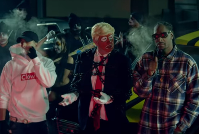 14 marca 2017Snoop Dogg nawinął parę linijek do podkładu z "Lavender" (efekt kolabo BadBadNotGood i Kaytranady) i wszystko to opatrzył klipem, który w mgnieniu oka obiegł świat. Teledysk utrzymany jest w konwencji koszmaru, w którym wszyscy ludzie przemienieni są w clownów – w tym Donald Trump. To, co przykuło uwagę republikańskiego senatora Marca Rubio (zresztą nie tylko jego), to zakończenie: raper mierzy z pistoletu do głowy kukły Trumpa. Polityk skwitował filmik tymi słowami: "Snoop shouldn’t have done that. We’ve had presidents assassinated before in this country, so anything like that is really something we should be very careful about… I think people could disagree on policy, but you gotta be very careful about that kind of thing. Because the wrong person sees that and gets the wrong idea, you can have a real problem. So I’m not sure what Snoop was thinking. He should think about that a little bit".