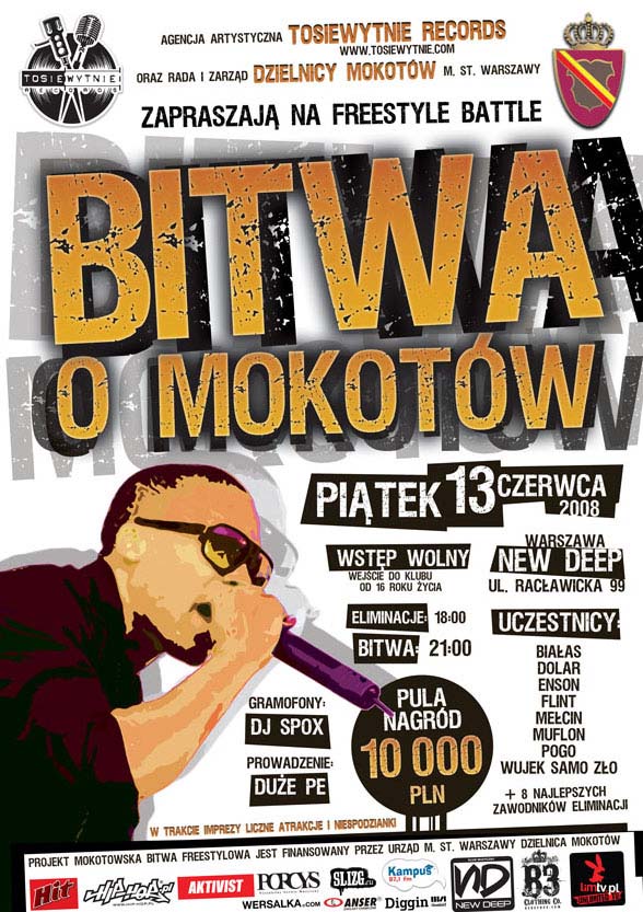 13 czerwca 2008 - New Deep (Racławicka 99) - Warszawa Wstęp wolny. Start eliminacji o 18:00. Start bitwy o 21:00. Prowadzenie Duże Pe, gramofony DJ Spox."Bitwa o Mokotów"