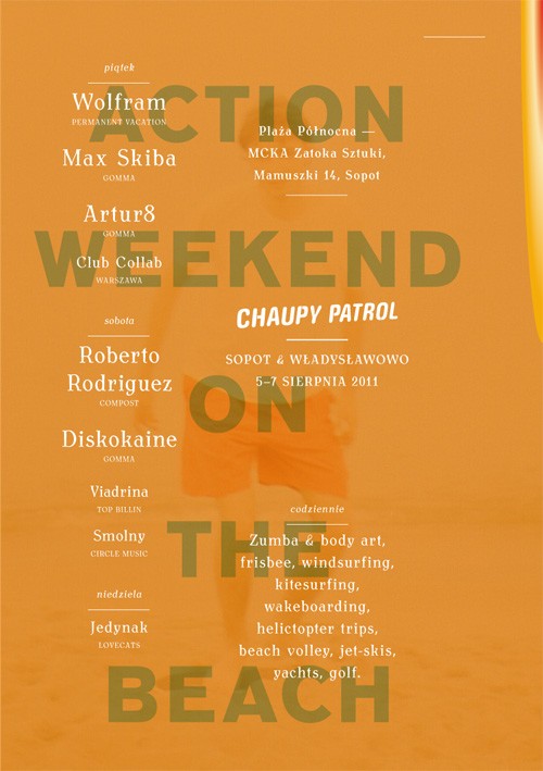 Chaupy Patrol 5–7 sierpnia, action weekend on the beach – Sopot & Władysławowo. Międzynarodowi DJ'e, jachty, helikoptery, joga i zumba na plaży, windsurfing, golf i to nie koniec atrakcji – party jakiego nie było, od rana do wieczora przez cały weekend.