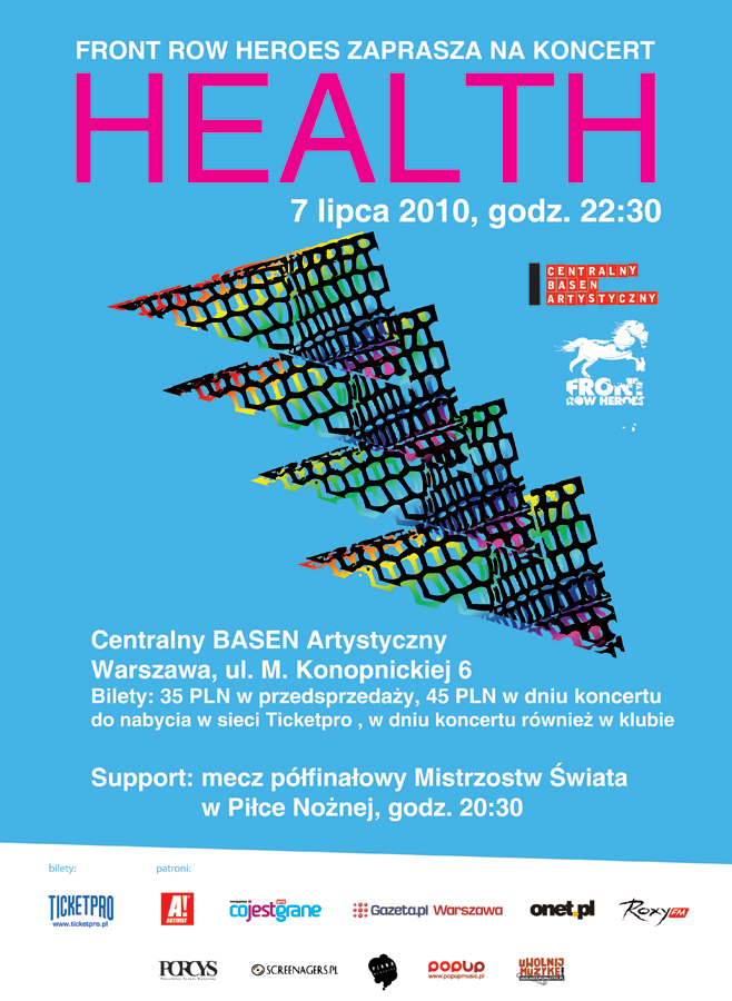 HEALTH to założony w Los Angeles (USA) zespół grający noise rocka, do eksperymentów z hałasem dodający elektroniczne dźwięki rodem z muzyki tanecznej i zaskakująco chwytliwe melodie. HEALTH to jedno z najnowszych objawień w świecie muzyki alternatywnej i idealny przykład na to, że niezbyt łatwe dźwięki również mogą przyciągać na koncerty tłumy. Zespół jest bowiem znany z niezwykłej energii i ekspresji na scenie, a ich koncerty to niezapomniane przeżycie.