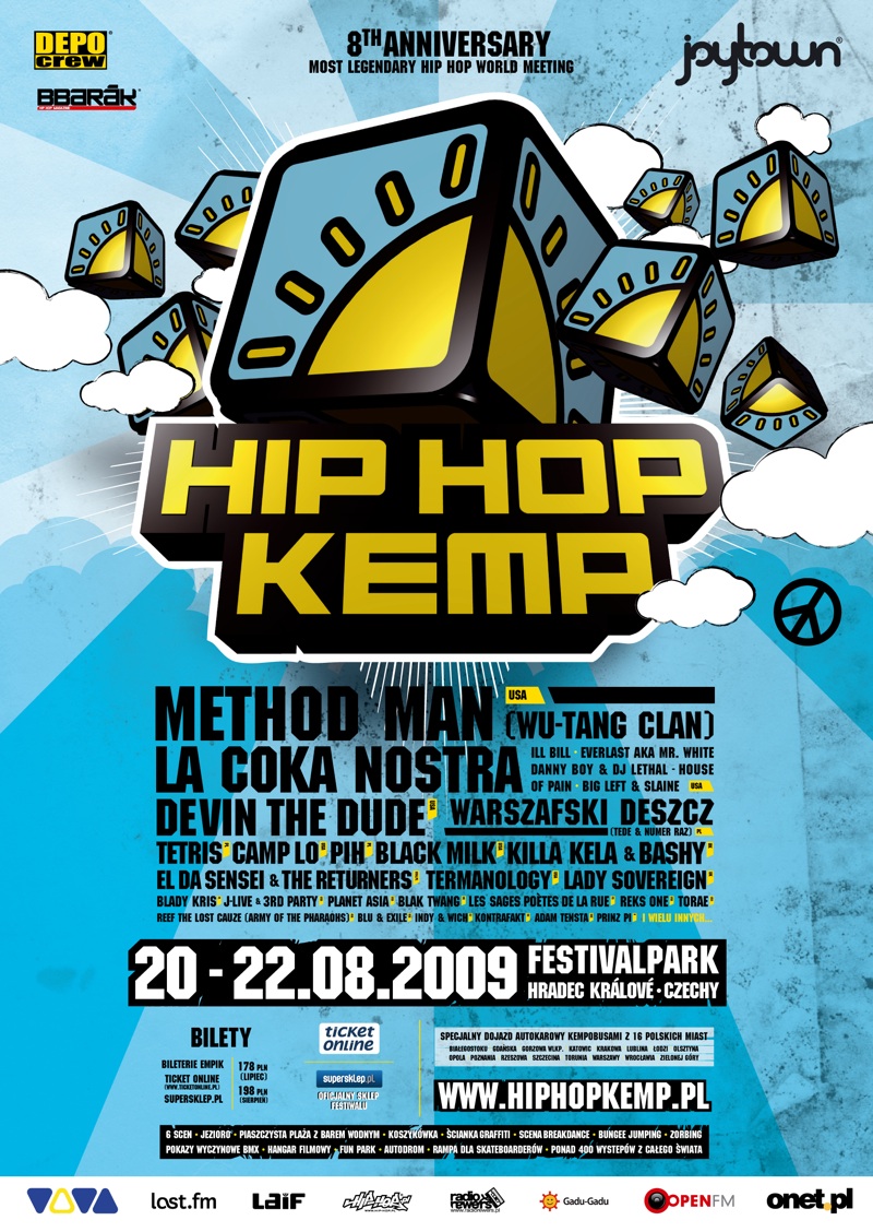 W tym roku Hip Hop Kemp odbędzie się w weekend 20-22 sierpnia po raz kolejny na malowniczym terenie FestivalParku, czyli dawnego lotniska w czeskim Hradec Králové (40 km od polskiej granicy w Kudowie Zdrój). Line-up zapowiada się iście imponująco: na liście ogłoszonych gwiazd znajdują się bowiem m.in. Method Man z Wu-Tang Clan – jeden z najbardziej charyzmatycznych emce w historii rapu, Devin the Dude – ikona upalonego g-funku, House of Pain i La Coka Nostra (autorzy nieśmiertelnego „Jump Around”), a także klasycy podziemia, jak Camp Lo, J-Live, Planet Asia oraz jego aktualni wymiatacze – Termanology, Torae, Black Milk czy Reks.