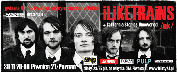 Pod koniec listopada 2008 nasz ponownie nasz kraj odwiedzi gwiazda ubiegłorocznego Off Festiwalu, brytyjska formacja iLiKETRAiNS. Pochodzący z Leeds zespół iLiKETRAiNS to jeden z popularniejszych indie-rockowych wykonawców na Wyspach. Ich ostatni album "Elegies to Lessons Learnt" wydany przez kultową wytwórnię Beggars Banquet został doskonale przyjęty w całej Europie, zbierając także rewelacyjne recenzje w Polsce. Zespół pracuje nad materiałem na nową płytę, z której utwory zaprezentuje w trakcie trasy. Jedyny koncert iLiKETRAiNS odbedzie się już 30.11 w poznańskim klubie Piwnica 21. Bilety w cenie 29/35 pln już do nabycia CIM, Piwnica 21, www.bilety24.pl
