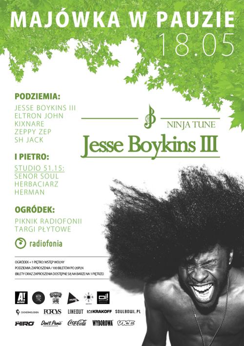 Majówka w Pauzie zawsze należała do najciekawszych wydarzeń muzycznych w ciągu roku. Dlatego już 18 maja zawita u nas Jesse Boykins III, który mianem " world soul" opisuję muzykę którą tworzy. RnB oraz Soul zbogacony o Boykinsowe ponadczasowe brzmienie i bardzo osobiste, emocjonalne teksty. Cały ten zestaw powoduje, że podczas koncertów na żywo tworzy się niesamowita więź pomiędzy artystą, a słuchaczami. Jesteśmy pewni, że impreza z Jesse Boykins'em zostanie przez nas wszystkich zapamiętana na długo.