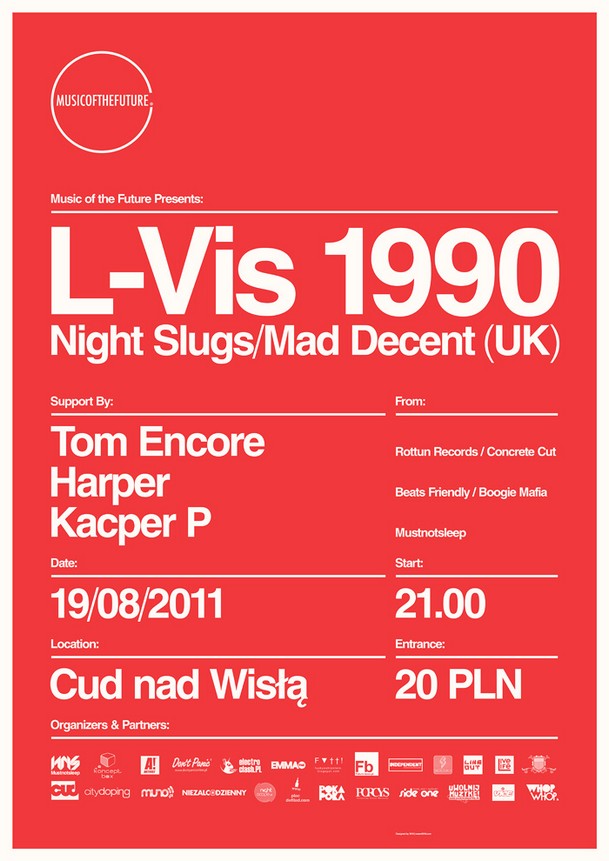 Music of the Future to impreza organizowana przez warszawski kolektyw Djski - Mustnotsleep, która kontynuuje profil działania kolektywu, czyli intensywne promowanie na terenie Polski inteligentnej elektroniki, by dotrzeć z tą muzyką do jak najszerszego grona słuchaczy i klubowiczów. Współorganizatorem cyklu jest warszawski Cud nas Wisłą. Ten wyjątkowy cykl dotychczas zaprezentował występy: Kowtona i Bok Boka z Wielkiej Brytanii oraz czołówki polskiej sceny producenckiej z zakresu nowej elektroniki: Shoju, The Phantom, Think. Na każdej imprezie swoje sety grają również Kacper P i Fau z Mustnotsleep.W sierpniu przyszedł czas na wakacyjną kulminację cyklu, do Cudu nad Wisłą zawita L-Vis 1990 (UK, Night Slugs), współzałożyciel wytwórni Night Slugs, jeden z najpopularniejszych remixerów brytyjskiej sceny, Jego produkcje to coś z pogranicza UK Garage, Ghetto, Dubstepu i Grime. Oprócz niego na scenie pojawi się jeden z najbardziej rozpoznawalnych producentów z Polski Tom Encore znany z takich nagrań jak “Jig” czy “Spellbound”. Pojawi się również Harper dj z ponad 10-letnim stażem, który jest jednym z najistotniejszych promotorów UK Funky w Polsce. Usłyszycie również gospodarza imprezy Kacpra P z kolektywu Mustnotsleep.