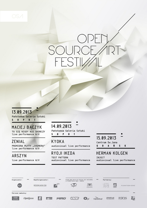 13 września 2013 - PGS - Sopot 14 września 2013 - PGS - Sopot 15 września 2013 - Centrum św. Jana - GdańskZ przyjemnością zapraszamy na Open Source Art Festival, gdzie będzie można zobaczyć m.in. Zeniala, Kyokę, Ryoji Ikedę czy Hermana Kolgena.