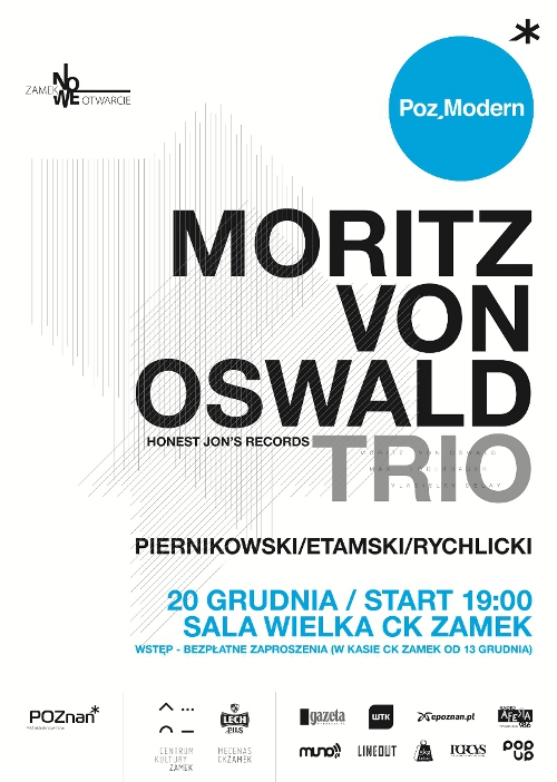 Moritz von Oswald to największa legenda berlińskiej sceny elektronicznej ostatniego ćwierćwiecza. Swoją muzyczną karierę rozpoczynał grając w kultowym postpunkowym składzie Palais Schaumburg. W latach 80. współpracował także ze sławnymi synth- popowymi zespołami Propaganda i Associates. U zarania lat 90. to dzięki niemu nad Szprewę trafili pionierzy nowej tanecznej elektroniki z Detroit, przyczyniając się w ten sposób do rozwoju artystycznej sceny miasta po upadku muru. Moritz von Oswald jest też założycielem "Mekki" winylowych kolekcjonerów – sklepu Hardwax, a także sławnej wytwórni Basic Channel – prototypowej dla setki kolejnych niezależnych oficyn. Nagrania twórców z tego wydawnictwa (i projektu Maurizio, którego współtwórcą jest Moritz) ukształtowały sławny undergroundowy „Berlin sound” – na pograniczu wibracji dub, tanecznej pulsacji i eksperymentów industrialu oraz awangardy. Moritz jest też częścią wybitnego kolektywu reggae: Rhythm And Sound. W Poznaniu pojawi się jednak w szczególnej odsłonie – w trzyosobowym zespole. Towarzyszyć mu będą nie mniejsze niż on indywidualności: pochodzący z Finlandii Sasu Ripatti – grający na instrumentach perkusyjnych, wykształcony jazzowo muzyk i jedna z barwniejszych postaci elektronicznej sceny (znany także jako Vladislav Delay i Luomo) oraz obsługujący analogowe syntezatory Max Loderbauer – w latach 90. z projektem Sun Electric, jeden z pionierów "nowych brzmień". Trzej wybitni muzycy w kolektywnej improwizacji doskonale łączą awangardowe tradycje niemieckiej elektroniki i Krautrocka z inspiracjami neoklasycznymi oraz fascynacjami jazzowymi. Moritz Von Oswald Trio związane jest z należącym do Damona Albarna (Blur, Gorillaz) wydawnictwem Honest Jon's Records.