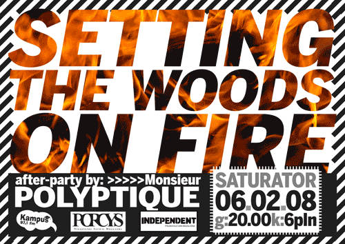 Setting the Woods on Fire - Gitarowe trio z Warszawy inspirowane wyciem amerykańskich strunowców w skład którego wchodzą: Marcin Buźniak (gitara, bass, wokal), Karol Koszniec (perkusja) i Piotr Mazurek (bass, gitara, wokal). Chłopcy generują super energetyczną jazdę, która sprawi że nie ustoisz. Zespół ma na koncie za równo występy w klubach jak i na festiwalach (m.in Fast Forward, Festiwal Rozproszonej Energii). Do ich osiągnięć należy między innymi: