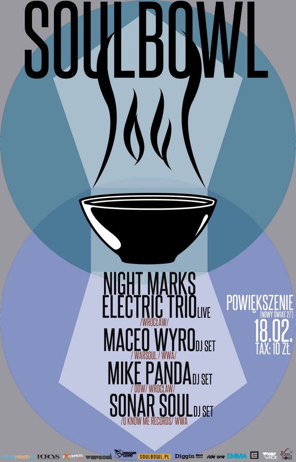 Już 18. lutego Powiększenie wypełni mocna drużyna SOULBOWL, która z każdym wydarzeniem będzie zmieniać swój skład na polskich i zagranicznych gości. Bardzo ciekawe koncerty, live act'y oraz dj sety w jednym. Event swoim występem na żywo oraz selekcją uświetnią: Night Marks Electric Trio (live!), Maceo Wyro (Warsoul), Sonar Soul (U Know Me Records), Temzki (zadba o czill na górze) oraz inicjator cyklu, Mike Panda (Soul Bowl/ DDW/ Wrocław), który wspólnie z portalem www.soulbowl.pl będzie bacznie czuwał nad całą ideą cyklu.