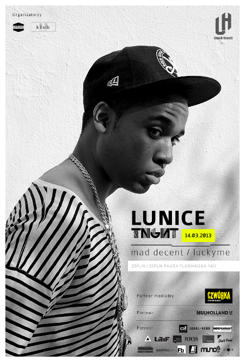 Po świetnym solowym występie w Warszawie Lunice powraca! Tym razem jako kolejny z gości cyklu imprez Urban Heroes aby swoją hip Hopowo – trapowo – basową stylistyką uraczyć publikę w Krakowie. Koncert będzie mieć miejsce 14 marca 2013 roku w krakowskiej Pauzie, a wszelkie dodatkowe informacje znajdziecie na stronie cyklu czyli: