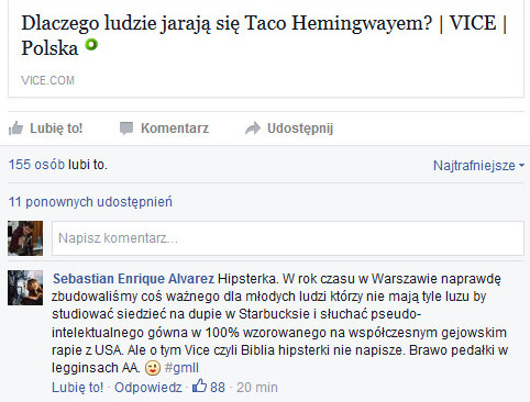 23 października 2015Raper Sentino (szerzej znany niemieckiej publiczności jako Sentence czy chociażby jako współpracownik legendy tamtejszej sceny hiphopowej, jaką niewątpliwie jest Fler, a w Polsce kojarzący się ze stylowym ulicznym rapem i zapadającymi w pamięć refrenami, których zwieńczeniem może być najpopularniejszy numer "Vitalyi") w dość nietuzinkowy sposób skomentował artykuł na facebooku serwisu VICE, odnoszący się do hajpu wokół Taco Hemingwaya.