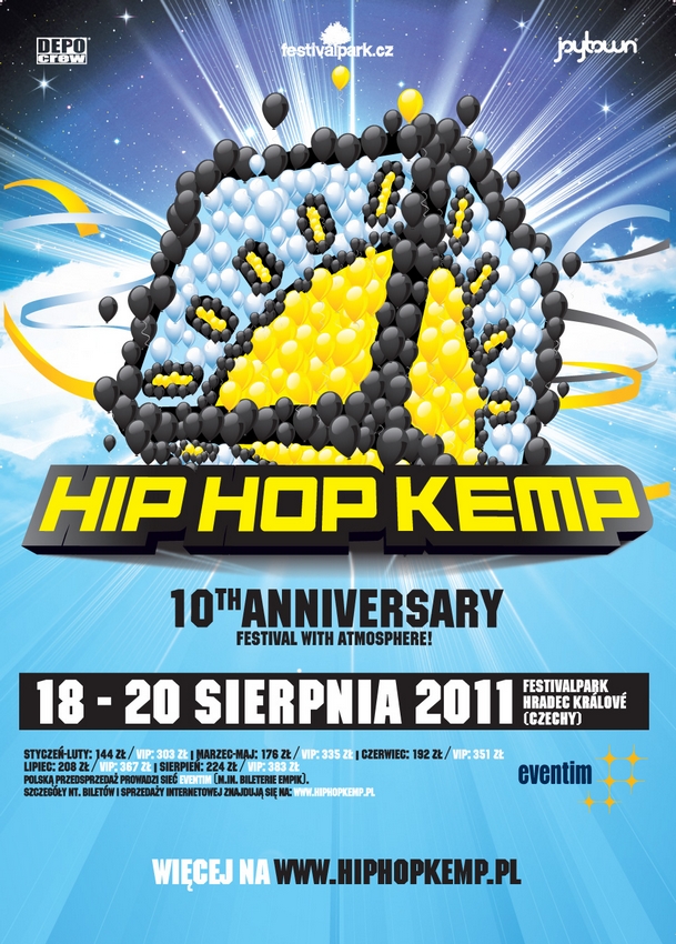 Agencja Joytown zaprasza! W tym roku fani brzmień rap i hip-hop z całej Europy będą hucznie celebrować jubileuszową, 10. edycję najważniejszego na naszym kontynencie święta czarnych brzmień. Festiwal Hip Hop Kemp, bo o nim mowa, startuje w czwartek 18 sierpnia 2011 r. w czeskim Hradec Králové, tuż przy polskiej granicy w Kudowie Zdrój i potrwa do soboty 20.08.