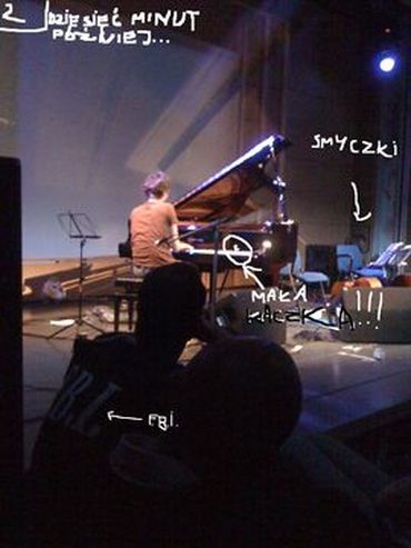 Zebraliśmy się wszyscy (a była nas mniej więcej dwudziestka) jak na jakimś tajnym zebraniu rządzącej światem, wszechwładnej masonerii. Sorry, ale mój kuzyn Ralf opowiadał mi ostatnio, że w Watykanie, Londynie i Waszyngtonie stoją ponoć jakieś starożytne egipskie posągi, które masońscy szpiedzy na wysokich, rządowych stanowiskach, postawili tam by przy pomocy światła słonecznego wskazywały przepowiedziany niegdyś przez Majów wielki kataklizm, który ma wstrząsnąć ludzkością (podobno pokazują na rok 2012). Wracając do nas – wybrańców... Czekaliśmy na scenie na swojego guru, mistrza, przewodnika – w kręgu, przy przygaszonych światłach. Kiedy wreszcie przyszedł, zapadła grobowa cisza (aż słychać było oddechy naszych sąsiadów). Wszedł, trochę nieśmiało, z lekko pochyloną głową, jakby zaniepokojony, speszony, onieśmielony i przemówił. A może i nic nie powiedział, tylko od razu wziął akustyka i zaczął grać... Nie wiem, nie wiem, nie pamiętam, nie mam pojęcia co się dalej działo, zaliczyłem między gały enerdowską pałą. Ostatnie co potrafię sobie przypomnieć, to droga do domu, na Natolin, samochodem Jędrzeja i przybliżanie łamaną angielszczyzną siedzącej na tylnym siedzeniu Kanadyjce z Quebecu oraz jej mężowi zawiłości sytuacji politycznej w naszym pięknym kraju (aha, Platforma i PiS to tak naprawdę to samo – prawica...). Oj zabawa była, jeny. –Paweł Greczyn